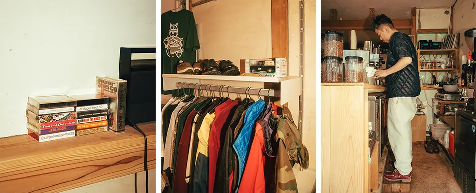 何種類ものコーヒーやクラフトビールを楽しめるだけでなく、ヴィンテージの服を中心にアパレルアイテムも展開する。