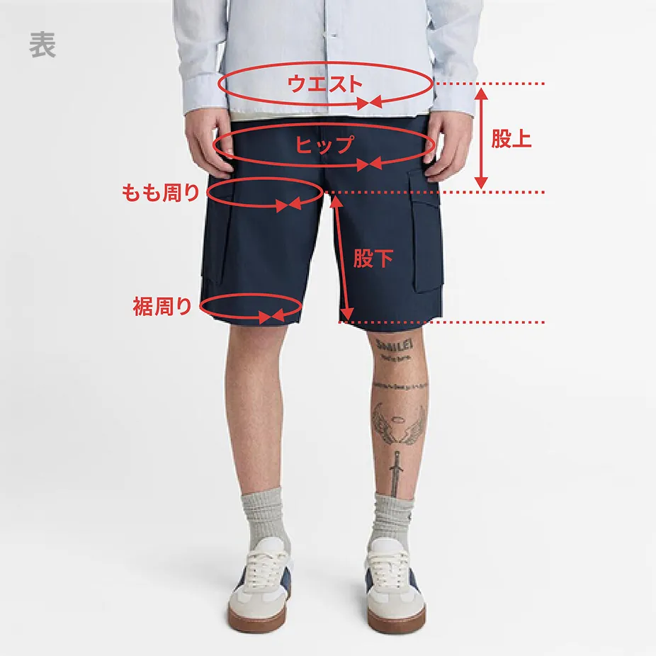 もも周り:股から2.5cm下の位置で裾から裾まで測り、一周を計測